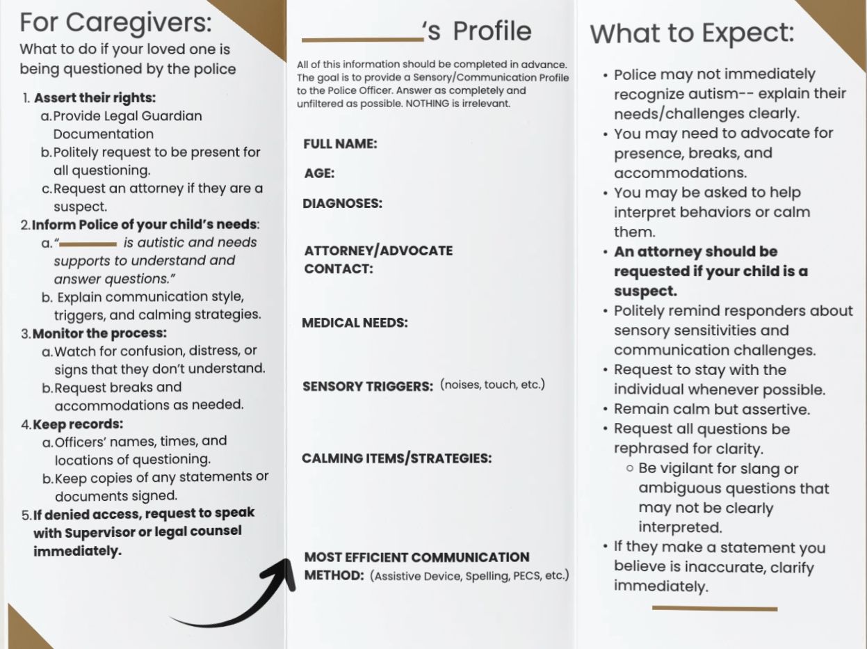 Clear, protective guidance for autistic individuals and caregivers during police questioning or interrogation.