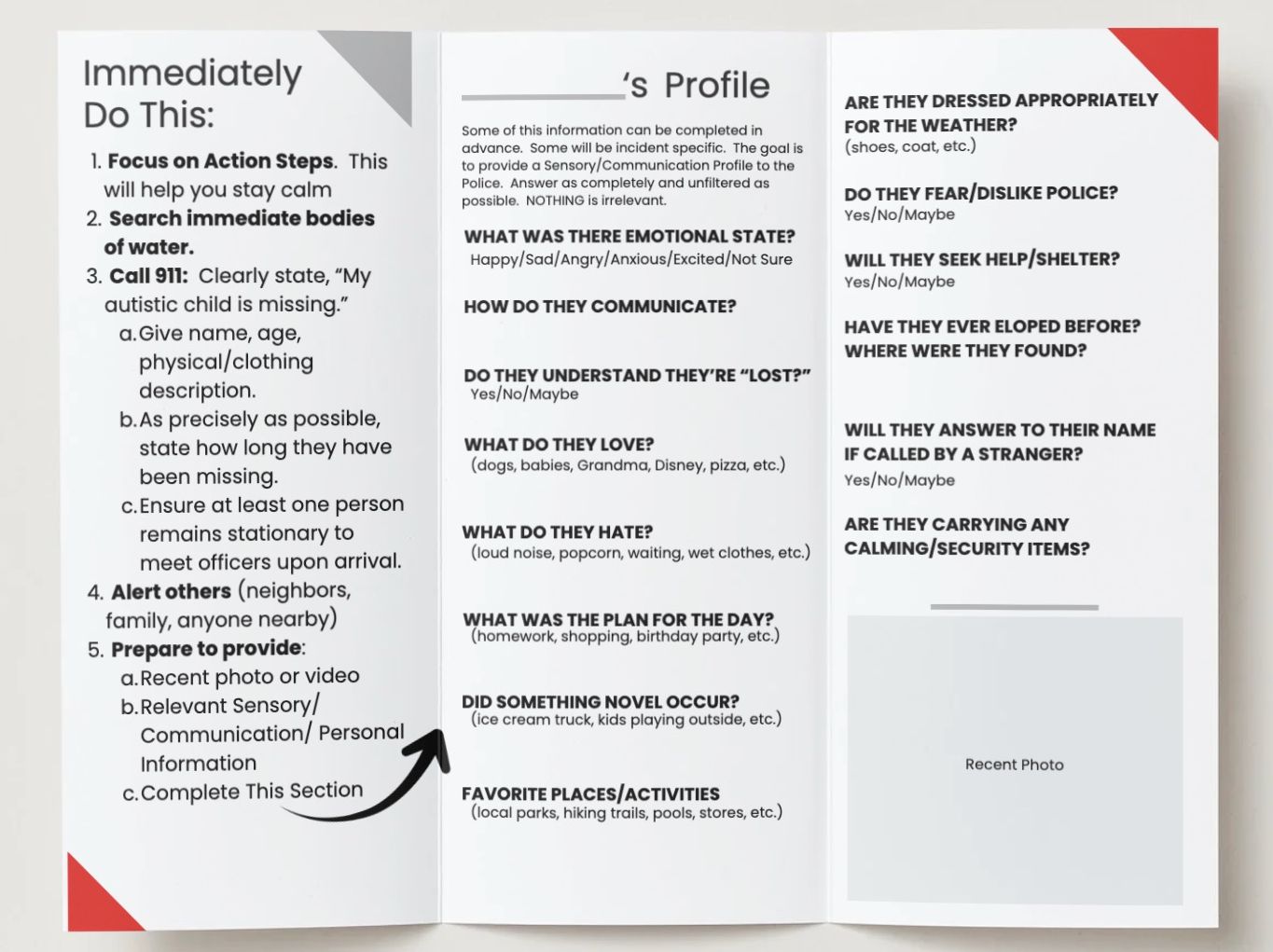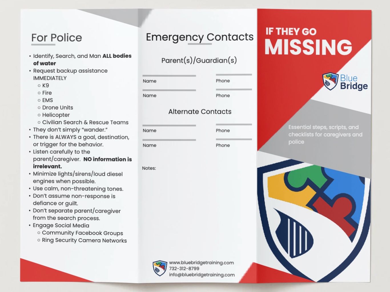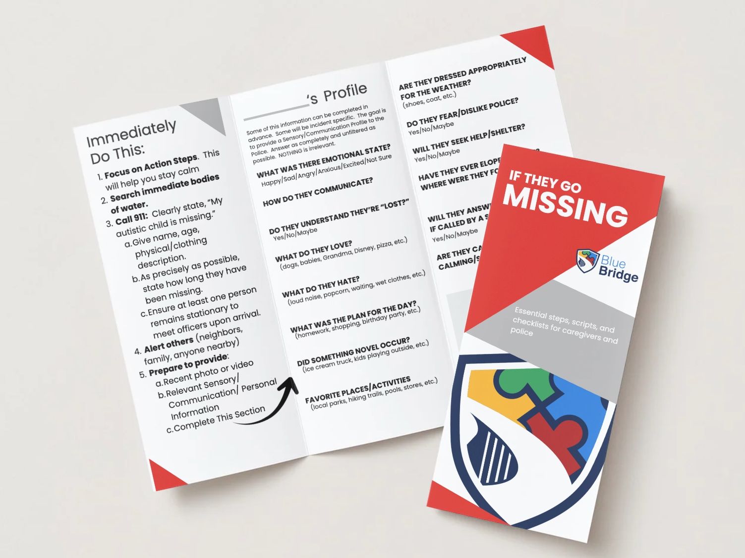This scenario guide gives parents and caregivers a clear, actionable plan for the critical first moments after a child with autism goes missing. It covers immediate search strategies, what to tell 911 and first responders, high-risk locations to check, and how to share your child’s unique needs. Includes fill-in sections for vital info, real-world success stories, and communication scripts to help police respond quickly and effectively.
